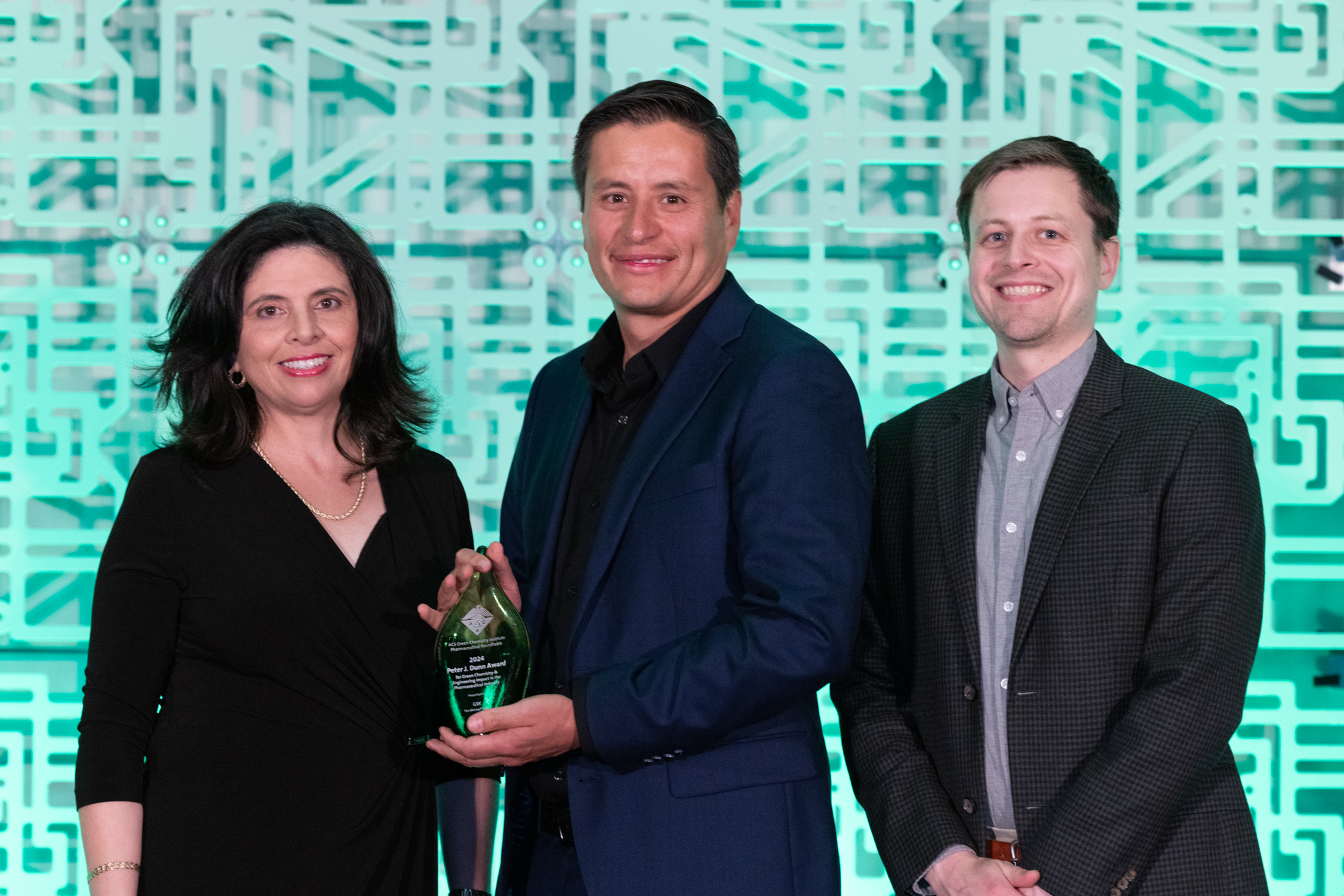 Pictured: Danny E. Mancheno, Principal Investigator at GSK, accepts 2024 Pete Dunn Award from Isamir Martinez (ACSGCI) and ACS GCIPR 2024 Co-Chair, Dan Bailey of Takeda.